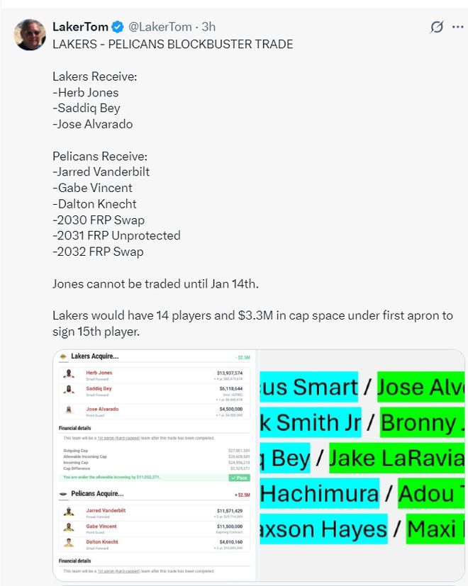 湖人媒體laker Tom為湖人模擬了一套大交易方案,他認(rèn)為湖人不該只交易赫伯特-瓊斯一人,湖人應(yīng)該借此機(jī)會(huì)擴(kuò)大交易進(jìn)行超級(jí)補(bǔ)強(qiáng)。
